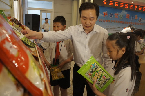 团中央学校部杜汇良副部长带领小学生进行“识标签、知营养、保健康”的游戏