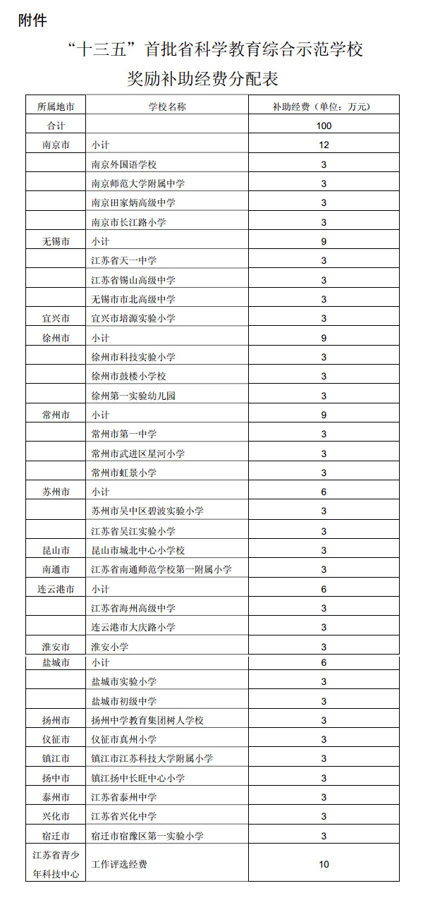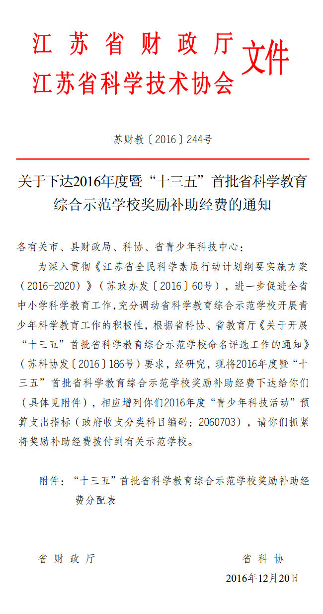 关于下达2016年度暨“十三五”首批省科学教育综合示范学校奖励补助经费的通知