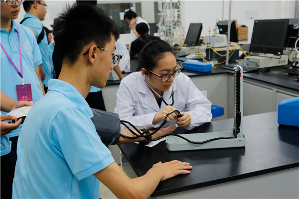 下午,营员们来到医学院,在医学院师生的指导下,学习了心肺复苏术等急救知识,体验了血压测量、血型鉴定、螨虫观察、组胚切片观察、病理切片观察、病理标本观察、轻粘土模型制作等特色活动。此外,营员们还参观了动物实验中心,近距离观察了人体标本,并对人体解剖、口腔结构与保健等方面的知识进行了学习。