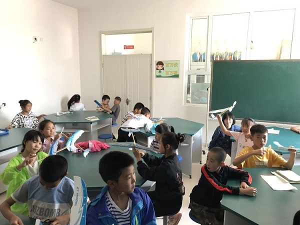 学生们第一次接触橡皮筋动力飞机,他们两两一组,努力拼装着。