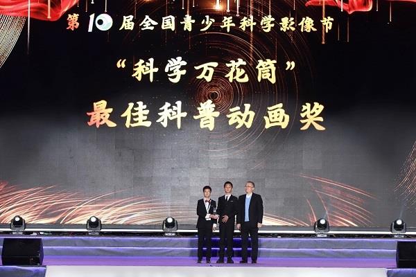 中国科协副主席、书记处书记孟庆海,四川省副省长王凤朝,四川省科协主席、中国工程院院士、四川大学校长李言荣为获得“科学万花筒”最佳作品奖的青少年创作者颁奖。