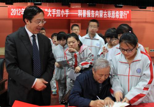 2012年中国科协“大手拉小手——科普报告内蒙古草原希望行” 活动由中国科协青少年科技中心、中国青少年科技辅导员协会、内蒙古科协主办。旨在全面落实国务院《全民科学素质行动计划纲要》和《中国科协“十二五”事业发展规划》,贯彻实施中央关于“下基层、办事实、转作风”的精神。报告团将行程1300多公里,途经自治区西部鄂尔多斯市、包头市、巴彦淖尔市、乌海市、阿拉善盟五个盟市,将在多所中小学校及党校、行政学院进行35场科普报告。