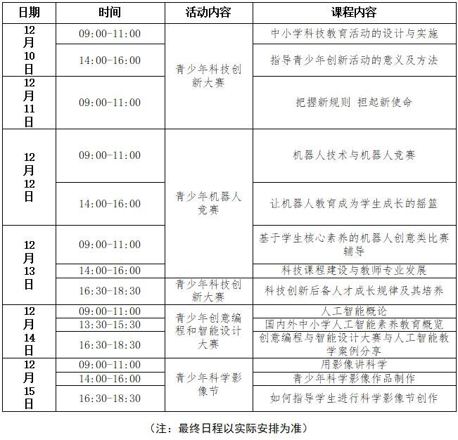 内容包括:青少年科技创新教育、机器人教育、人工智能教育及青少年科学影像节等四个版块,共计28课时。