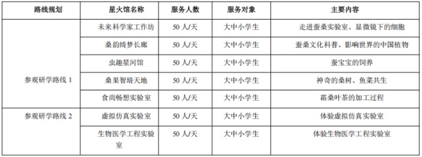 参观研学路线1:科研楼蚕桑研究室(20分钟)-教学实验室(15分钟) - 产品研发室(10分钟) - 核心栽培区(20分钟) - 蚕桑文化长廊(15分钟) - 高校星火馆科普展厅(40分钟)。