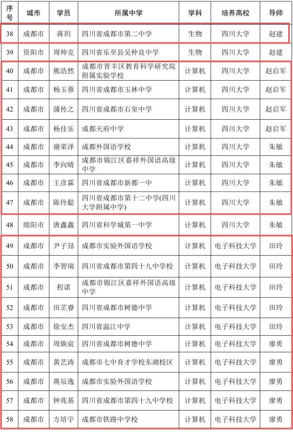 近日,2025年“中学生英才计划”(四川省)工作,经网上审查、学科潜质测试和导师面试选拔,入选学生名单已出炉,成都市共有54人入选。