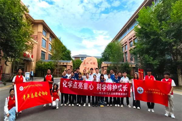 科普月期间,我校师生走出校门,深入中小学、社区开展科普宣传、实验展演、实验室参观与标本制作等服务,推动科普资源下沉,助力科学教育均衡发展。河北师范大学化学与材料科学学院青年志愿者协会于2025年9月26日组织志愿者前往石家庄市特殊教育学校开展“化学点亮童心,科学伴护成长”志愿活动。活动过程中,志愿者向孩子们展示了“蓝色星云”“可乐变雪碧”“指纹检验”等五个化学实验。这些神奇的化学现象,瞬间抓住了孩子们的目光,激发了他们浓厚的学习兴趣。志愿者们的耐心陪伴和细致讲解,满足了孩子们对化学世界的好奇心,点燃了他们探索化学世界的热情