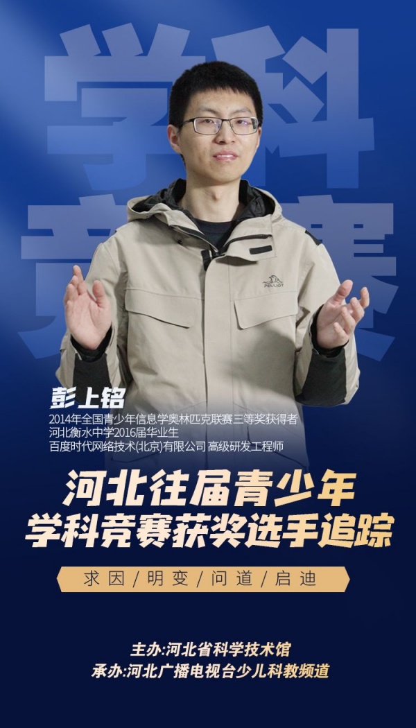 每一次走出舒适区的尝试,都是一次自我边界的拓展,世界远比书本和屏幕更广阔。人生,不应该是一张被规划好的标准图纸,而应该是一副由我们亲手绘制的充满无限可能的探索地图。大家好,我是彭上铭,我从河北衡水中学走出,正用一行行代码敲开探索未来的大门。2006年是我第一次接触电脑,那个时候的互联网还没有现在这样快,但那个虚拟的世界已经足够让人着迷,现在回过头来看,中国互联网这几年的发展和PC时代相比,移动互联网现在发展的可以说是突飞猛进,但真正让我产生以后和计算机打交道的想法,那还要追溯到高一年级,决定参加信息学竞赛。
