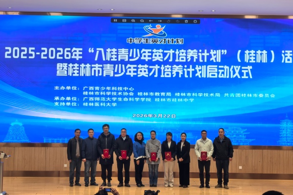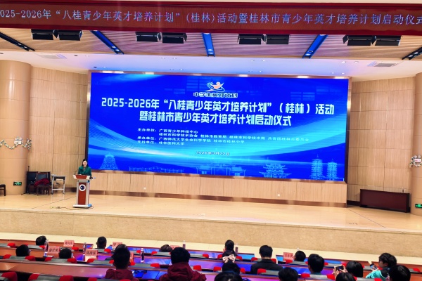 2026年3月22日,2025-2026年“八桂青少年英才培养计划”(桂林)活动暨桂林市青少年英才培养计划启动仪式在桂林中学(临桂校区)顺利举行,市科协主席梁劲等出席活动,来自桂林中学、桂林市第十八中学等学校的24名中学生,将获高校名师指导开展科研实践。