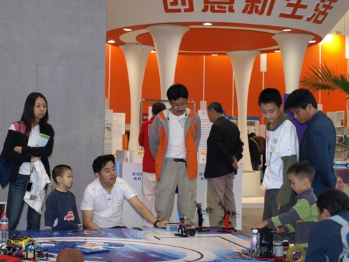 一进展览区,就能看见白色的展台上摆着各种新奇模型,有发射塔,月球车等,这是广州市越秀区旧部前小学制作的“我们的登月之旅”机器人创意作品。作品自动模拟火箭升空、太空漫步等环节,能够清晰展示登月探索的主要太空航行过程,为人们了解航空知识提供有效的平台。而在它旁边展示的是江苏省江都中学制作的“智能太空旅游系统”,太空飞船、模拟太空场地、补充燃料装置等应有尽有。这两个展览作品相互呼应,把游客带进了绚丽的太空世界。