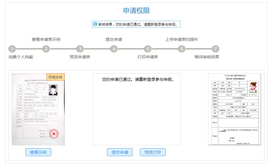 新用户(注册账号后)或指导教师(已有账号)填写完了个人档案保存职业信息页面之后,页面会自动跳转至【申请权限】页面,或点击左侧导航栏中的【权限申请】进入申请权限页面,请认真阅读申请流程,及页面信息,点击【提交申请】按钮提交信息,点击【预览打印】按钮,下载打印申请表,签字盖章扫描之后,点击【上传证明】将申请表图片上传至申报系统,之后等待或联系省级管理员审核。