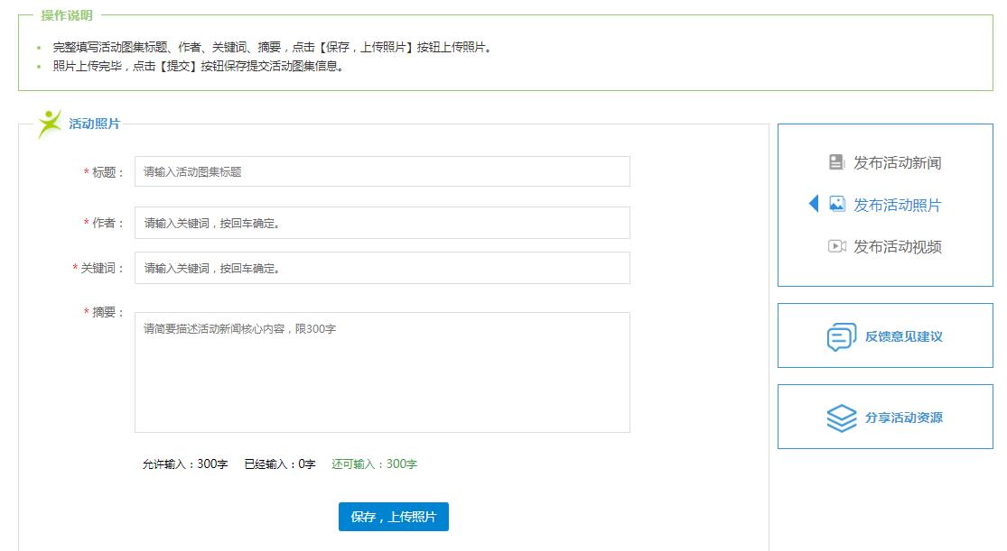 点击页面右侧导航“发布活动照片”发布照片,点击“上传照片”发布活动照片,一个图集中可以上传发布多张照片。