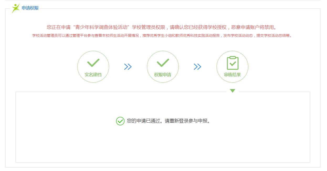 用户申请“青少年科学调查体验活动”学校管理员权限,需确认是否已经获得学校授权,恶意申请账户将禁用。