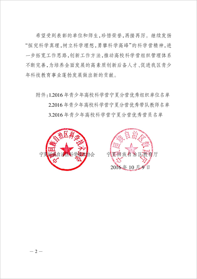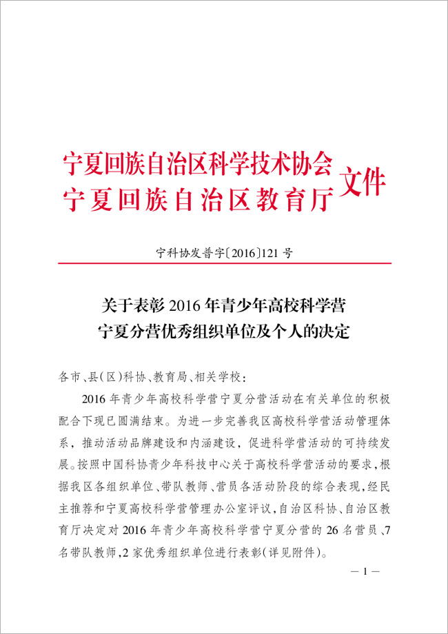 ●附件、原文件打印版下载: 关于表彰2016年青少年高校科学营宁夏分营优秀组织单位及个人的决定.pdf