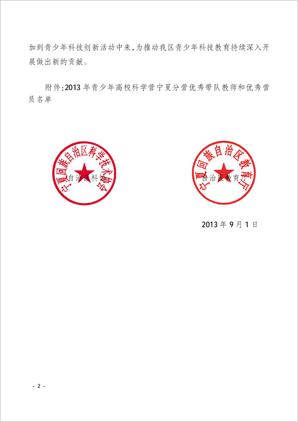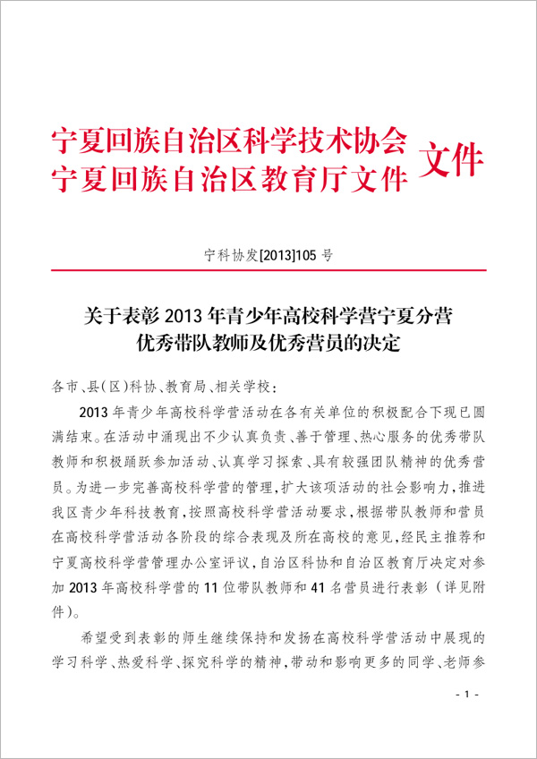 相关下载: ●附件: 2013年青少年高校科学营宁夏分营优秀带队教师及优秀营员名单 ● 原文件打印版: 关于表彰2013年青少年高校科学营宁夏分营优秀带队教师及优秀营员的决定.pdf