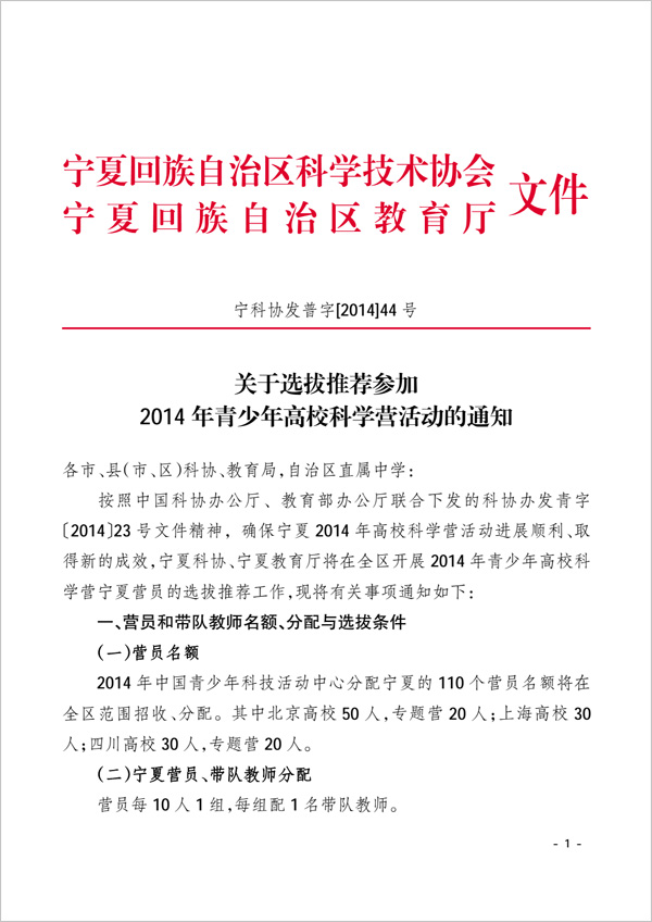 关于选拔推荐参加2014年青少年高校科学营活动的通知