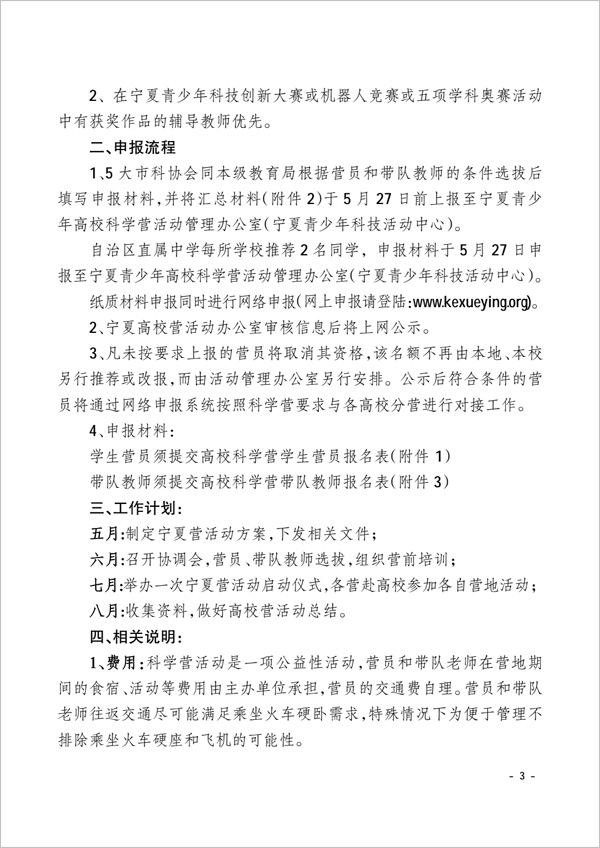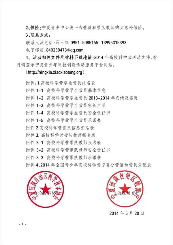 相关下载: ●附件: 附件1 高校科学营学生营员报名表 附件1-1 高校科学营学生营员基本信息 附件1-2 高校科学营学生营员2013-2014年成绩及鉴定 附件1-3 高校科学营学生营员家长声明 附件1-4 高校科学营学生营员安全责任书 附件1-5 高校科学营学生营员承诺书 附件2 高校科学营营员信息汇总表 附件3 高校科学营带队教师报名表 附件3-1 高校科学营带队教师报名表 附件3-2 高校科学营带队教师安全责任书 附件3-3 高校科学营带队教师承诺书 附件4 2014年全国青少年高校科学营宁夏分营活动营员分配表 ● 原文件打印版: 关于选拔推荐参加2014年青少年高校科学营活动的通知.pdf