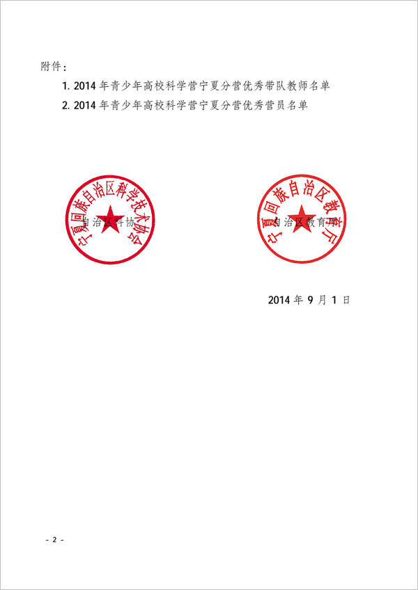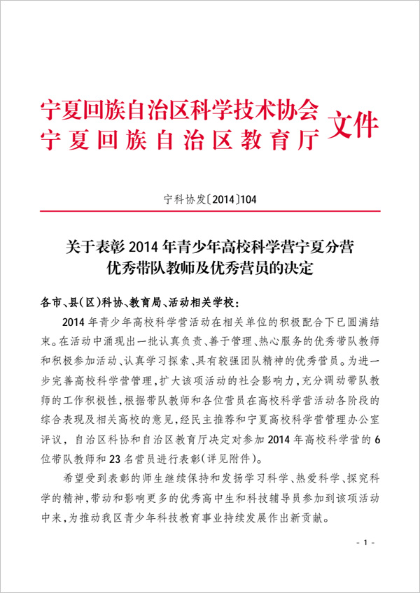 相关下载: ●附件: 1. 2014年青少年高校科学营宁夏分营优秀带队教师名单 2. 2014年青少年高校科学营宁夏分营优秀营员名单 ● 原文件打印版: 关于表彰2014年青少年高校科学营宁夏分营优秀带队教师及优秀营员的决定.pdf
