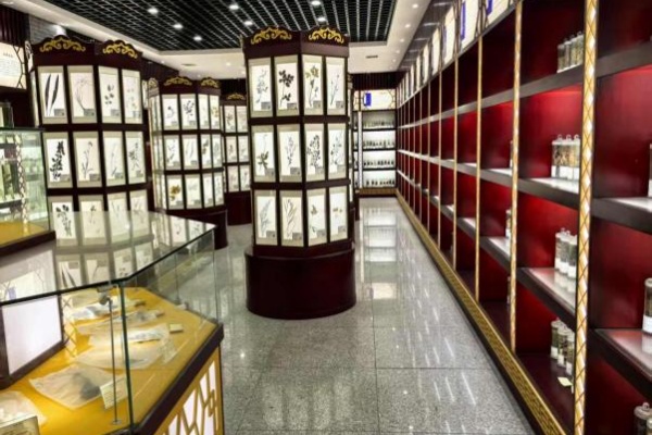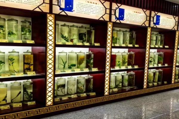 中医药文化馆位于中医学院2层,文化馆分为东区和西区,西区是中医文化展示,主要陈列了一些仿制的文物,展示中医的源流与发展历程,东区则是中药标本馆,陈列了数百种中药标本。东区的标本馆内容丰富,陈列了三种形式的中药标本:浸制标本、腊叶标本、中药饮片标本,其中浸制标本180种,腊叶标本200种,中药饮片标本600种。浸制标本是将新鲜的植物标本浸泡中药保鲜液中,使其保持原有的形态结构和颜色,便于我们认识这些中草药最原始的模样。中间的六个木质棱柱上旋转着的是200种腊叶标本,置身其中,感悟自然与生命,体会中药的历史与发展。