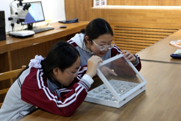 步入自然馆与地质馆,仿佛踏入了一个浓缩的自然宇宙。形态各异的生物标本静默陈列,熠熠生辉的矿物晶体错落有致,每一件展品都仿佛在低语着地球亿万年的沧桑变迁。在一块呈辉纹状的重晶石晶体前,志愿者驻足讲解:“它的形成,与剧烈的地质运动和复杂的化学作用息息相关,是大自然鬼斧神工的杰作”。 同学们围拢倾听,目光专注,神情中写满好奇与思索。每当讲解间隙,便有同学迫不及待地举手发问,问题层出不穷,思维的火花在展厅中碰撞。志愿者们始终耐心解答,用通俗而生动的语言,将深奥的自然奥秘与地质现象娓娓道来。一问一答之间,科学的种子悄然播撒,同学们的好奇心被彻底点燃,探索自然的热忱也在心中悄然生长。