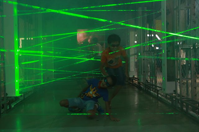 小朋友们正在接受“勇闯激光阵”的严峻挑战(韦国凯 摄)