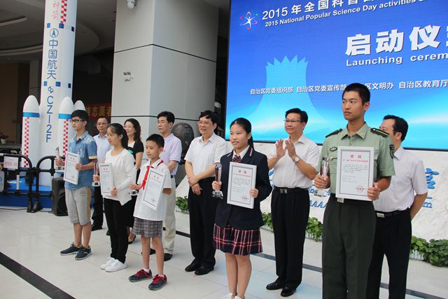 科学节启动仪式上颁发了第三届广西青少年科技创新奖,广西青少年科技创新奖由自治区科协、文明办、教育厅、科技厅、共青团广西区委共同发起设立,是表彰青少年学生科技创新和发明创造的荣誉奖项,本届创新奖评出了5个获奖项目,包括桂林电子科技大学张志恒、戴雷的《基于水解反应的便携式落水紧急救生器》,柳州高级中学熊华森、韦梓凌、李埼熠的《关爱老人——家庭小护士机器人的设计与制作》,桂林市逸仙中学杨馨颖的《智能型输液箱》,河池市第二高级中学李嘉欣的《一种保芯耐用削笔器》,钦州市灵山县新星小学姚睿的《双体希罗喷泉》,其中,《一种保芯耐用削笔刀和基于水解反应》和《基于水解反应的便携式落水紧急救生器》两个项目已获得专利。获奖项目在启动仪式当天向现场观众展示,获奖者还为观众解疑答惑。