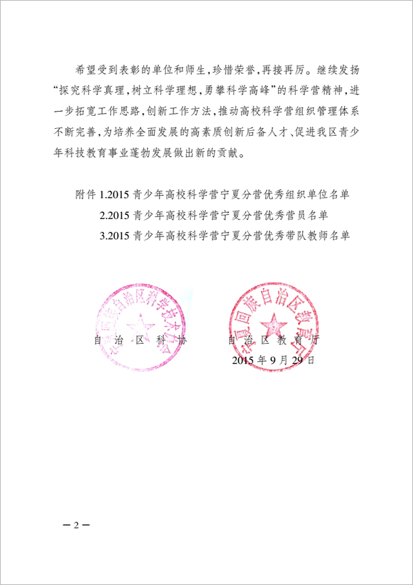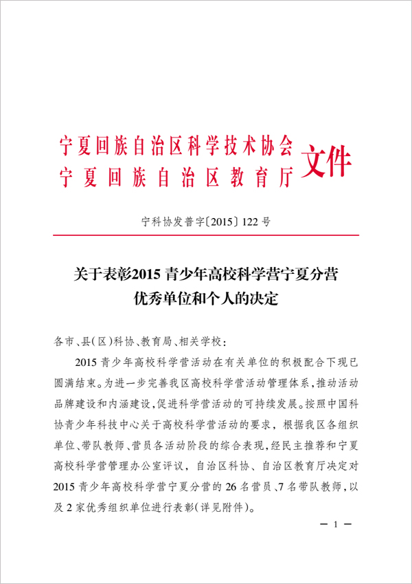 关于表彰2015青少年高校科学营宁夏分营优秀单位和个人的决定