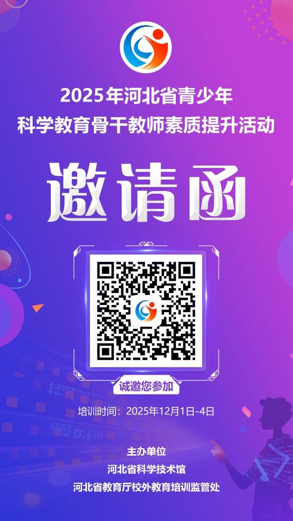 为进一步提高我省青少年科学教育骨干教师的科学素养和专业能力,促进我省青少年科技竞赛和科技创新活动高质量发展,河北省科学技术馆和河北省教育厅校外教育培训监管处将以线上线下相结合的形式,联合开展2025年河北省青少年科学教育骨干教师素质提升活动,现将有关安排通知如下: